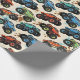 This dynamic monster truck pattern boys' wrapping paper features a repeating design of colorful red, blue, and teal monster trucks catching air, with realistic mud splatters. It is perfect for young racing fans and truck enthusiasts.