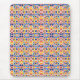 Colorful mouse pad with intricate geometric tile pattern in red, blue, and yellow, featuring a rounded rectangular shape. A white mouse lies beside it.