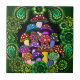 A tile with colorful psychedelic mushrooms surrounded by green paisley and green mandalas.