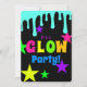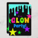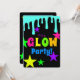 This bright and colorful party invitation features a black colored background with neon text and images. The front of the invitation features teal paint drips along the top portion with the phrase "It's a GLOW Party!" printed in various neon colors. Several matching neon stars are placed around the text.