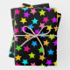 Colorful teal, yellow, pink, purple, and blue neon stars on black gift wrapping sheet set.