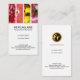 A simple white cover accentuated by four bright columns at the top of the card representing four super fruits i.e. pomegranate, grapefruit, lemon and apples. Below these fruits lie your prestigious name and job title. This is followed by two slogan options to advertise your services and finally the contact details at the base of the card.