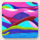 Colorful abstract landscape of hills and an ocean in colors of pink, purple, blue, green, and cyan.