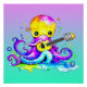 Funny poster with a cute colorful cartoon octopus playing a guitar. Purple, blue, teal, mint green, yellow. All the colors pretty much used in this.