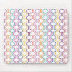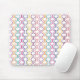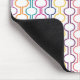 This mouse pad has an art deco design of orange, turquoise, pink, blue, purple, and yellow half circles connect with lines on a field of white.