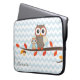 Cute colorful owl laptop case done in a light blue and white chevron pattern and graphics of a tree branch with two owls. Personalize the brown script text for yourself or as a fun gift idea.
