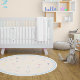 Unique education alphabet ABC typography in colorful pastel blue, yellow, pink, purple, green color for your children toddlers in round beige background color nursery rug. Cute way to decorate nursery room for your little one. Lovely funny and sweet mood.