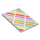 Geometric linear, rectangle, striped pattern of rainbow pastel hues of blue, orange, green, pink, purple, red and yellow.