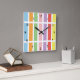 Geometric linear, rectangle, striped pattern of rainbow pastel hues of blue, orange, green, pink, purple, red and yellow.