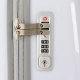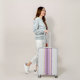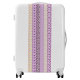 A white suitcase with a colorful patterned band around it, the band is composed of vertical stripes with different patterns, including planets, leopard print, stars and geometric shapes, the suitcase has a glossy finish and is standing on four wheels.