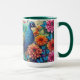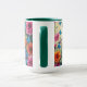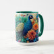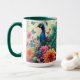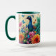 This coffee mug has two peacocks surrounded by flowers. It's all colorful.