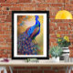 This print features a beautiful peacock with colorful feathers in shades of blue, green, red, orange and yellow on a complimentary background. This unframed print is available in many sizes to fit standard frames.