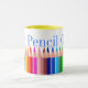 Great for kids, teachers, or anyone's desk, this colorful mug has graphics of colored pencils lined up, all around the mug. Blue text reads My Pencil Cup. Makes a nice teacher's gift, mother's day gift, or a special gift for your favorite child, just add pencils or crayons for a sweet gift.