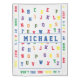 Kids Personalized Alphabet design features a background of the alphabet in bright, colorful stencil lettering, just like that of the refrigerator magnets we all know! Child's name is displayed cross the center in blue. Reverse side features child's monogram against a bright solid blue background. A great addition to any kids' bedroom! Designed to coordinate with the "ABC Baby Shower and Nursery Collection." Also available in red.