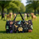 This unique duffle bag features a bold black background adorned with a colorful pattern of colored paw prints and bones in various vibrant hues. It's a cute design pet accessory and functional travel carrier for any pet lover.