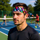 Joyful Tie Headband for pickleball playing relatives or friends. Colorful diagonal pickleball paddles 💚❤️💛💙 on black background.