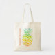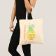 Summer themed reusable canvas tote, with graphics of a big colorful pineapple. Orange text reads Tropical Summer and can be personalized to read what you want. Great for shopping or the beach.