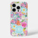 Customize this gorgeous modern colorful flower garden of flowers in pink, blue, orange, yellow and white iPhone 15 pro case with your your initials in a modern CAP font in white on blue. It's so vibrant and happy!