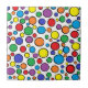 Abstract art of polka dots of different colors outlined in black against a white background.