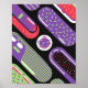 A playful pop art abstract design featuring candy-shaped patterns in bright lime green, purple, and red on a bold black background. Each candy form is decorated with sprinkles, stripes, and dots, creating a fun and energetic Memphis-inspired style. The vibrant composition brings a sweet, modern, and youthful aesthetic.