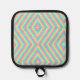 Colorful pot holder with a vibrant, geometric pattern of concentric diamonds in pink, blue, and green on the front; plain black fabric on the back.