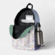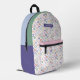This Colorful Printed Backpack features a rainbow of fun and whimsical hand-drawn geometric circles / dots with matching sides of green, purple, pink and blue. Easily personalized with a name for a stylish and customized touch.