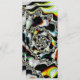 This colorful bookmark features an abstract, psychedelic spiral fractal art in black and white with yellow, orange, blue, and green accents.