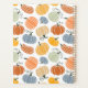 This design features a vibrant and modern pattern of pumpkins in a variety of shapes and colors. The design includes stylized pumpkins in shades of orange, yellow, beige, blue, and green, all set against a clean white background. The pumpkins are depicted with smooth, curved lines and subtle shading, giving them a sleek and contemporary look. Each pumpkin has a different stem, some with curly vines, adding a touch of whimsy to the pattern. The overall design is fresh and festive, perfect for adding a splash of autumnal color to any project or décor.