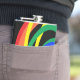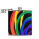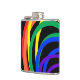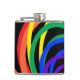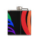 This brightly colored flask displays an abstract three dimensional pattern of rainbow crescent moons in colors of red, orange, yellow, green, blue and purple on a black background.