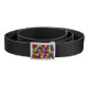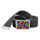 Jigsaw puzzle pattern in colorful rainbow colors on belt buckle, the belt itself is black.