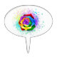 Large, blooming rose with rainbow petals on white background, painted over with splashes of colorful, bright paint. 3d