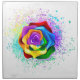 Large, blooming rose with rainbow petals on white background, painted over with splashes of colorful, bright paint. 3d