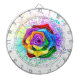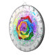 Large, blooming rose with rainbow petals on white background, painted over with splashes of colorful, bright paint. 3d