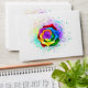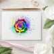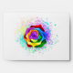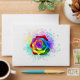 Large, blooming rose with rainbow petals on white background, painted over with splashes of colorful, bright paint. 3d