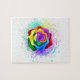 Large, blooming rose with rainbow petals on white background, painted over with splashes of colorful, bright paint. 3d