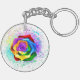 Large, blooming rose with rainbow petals on white background, painted over with splashes of colorful, bright paint. 3d