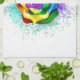 Large, blooming rose with rainbow petals on white background, painted over with splashes of colorful, bright paint. 3d