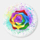 Large, blooming rose with rainbow petals on white background, painted over with splashes of colorful, bright paint. 3d