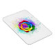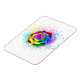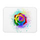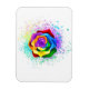 Large, blooming rose with rainbow petals on white background, painted over with splashes of colorful, bright paint. 3d