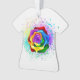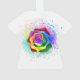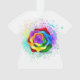 Large, blooming rose with rainbow petals on white background, painted over with splashes of colorful, bright paint. 3d