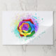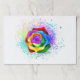 Large, blooming rose with rainbow petals on white background, painted over with splashes of colorful, bright paint. 3d
