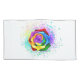 Large, blooming rose with rainbow petals on white background, painted over with splashes of colorful, bright paint. 3d