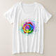 Large, blooming rose with rainbow petals on white background, painted over with splashes of colorful, bright paint. 3d