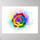 Large, blooming rose with rainbow petals on white background, painted over with splashes of colorful, bright paint. 3d