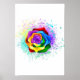 Large, blooming rose with rainbow petals on white background, painted over with splashes of colorful, bright paint. 3d
