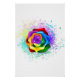 Large, blooming rose with rainbow petals on white background, painted over with splashes of colorful, bright paint. 3d