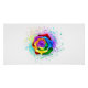 Large, blooming rose with rainbow petals on white background, painted over with splashes of colorful, bright paint. 3d
