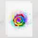 Large, blooming rose with rainbow petals on white background, painted over with splashes of colorful, bright paint. 3d