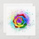 Large, blooming rose with rainbow petals on white background, painted over with splashes of colorful, bright paint. 3d