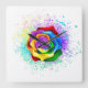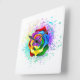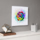 Large, blooming rose with rainbow petals on white background, painted over with splashes of colorful, bright paint. 3d